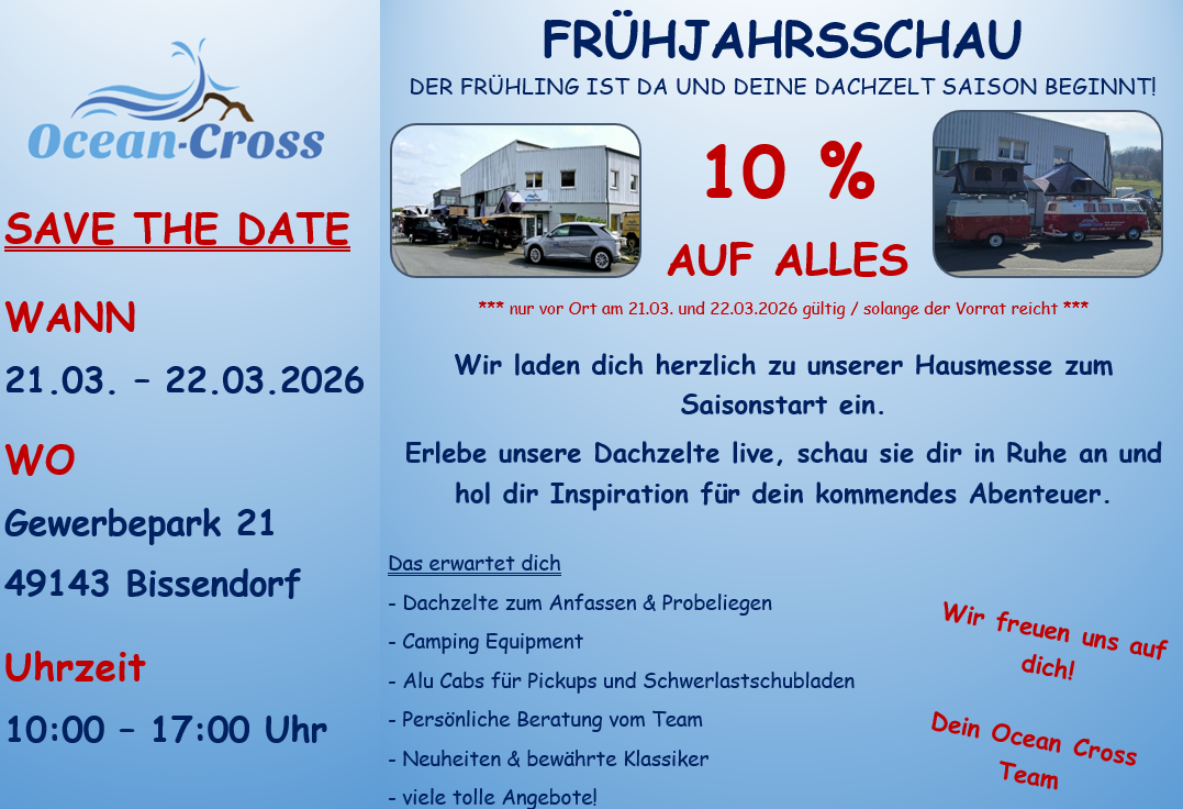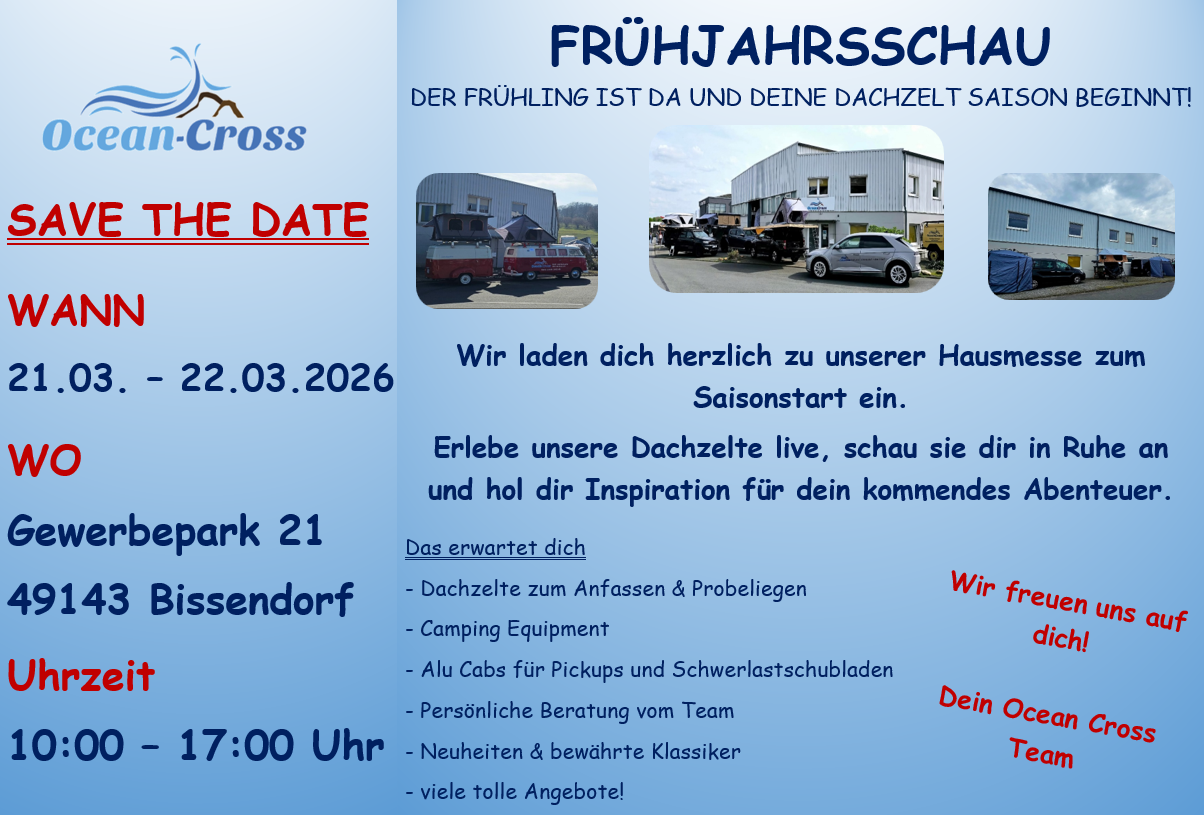 Ocean Cross steht für deutsche Zuverlässigkeit, sehr gute Qualität und erschwinglichen Preis. Wir haben eine klare Vision für die Entwicklung des Unternehmens: Wir suchen nach neuen interessanten Produkten, die das Offroad-Reisen noch komfortabler und zugänglicher machen. Bei unserer Arbeit nutzen wir unsere langjährige Erfahrung, um Produkte ständig zu verbessern und sie an technische Innovationen anzupassen.