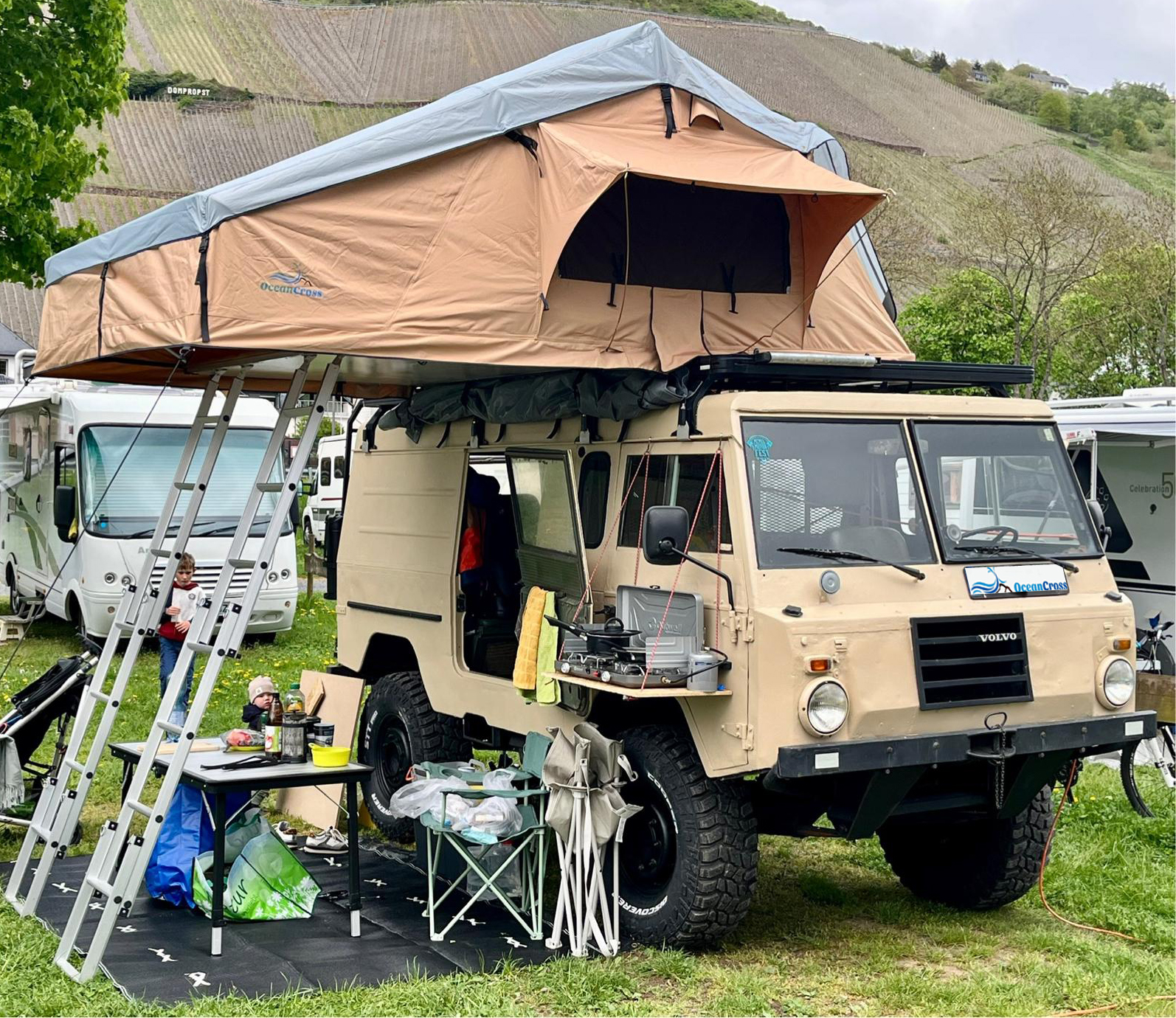 Das Dachzelt hat einen ausklappbaren Zeltteil der die Leiter überdacht. Ein entscheidender Vorteil bei Regen. Der Eingang ist geschützt und du gelangst trocken ins Zelt. Und das bei einem zu vernachlässigendem Gewichtsaufschlag. Wir haben diesen zusätzlichen Zeltraum auch gern zum Aufhängen von nassen Regenjacken genutzt. Hier kann das optionale Vorzelt mit einem Zipper angeschlossen werden. Dann entsteht ein großer trockener Raum unter dem Dachzelt.